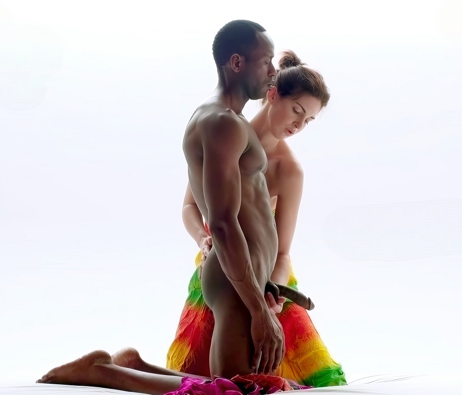 Стройная голая красавица делает настоящий тантрический массаж голому чернокожему парню, уделяя особое внимание его пенису.